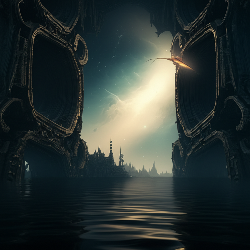 They stumbled upon what Aris first took for carvings, ancient glyphs etched into a colossal, cyclopean archway that dwarfed any cathedral on Earth. But closer inspection revealed them to be more complex than mere symbols. They weren’t carved onto the surface, but woven into it, shifting and subtly changing form as he looked at them, like living light within the obsidian. They pulsed with the faint glow he’d seen earlier, revealing impossible, fractal geometries that seemed to imply more than they showed, hinting at dimensions beyond immediate perception.